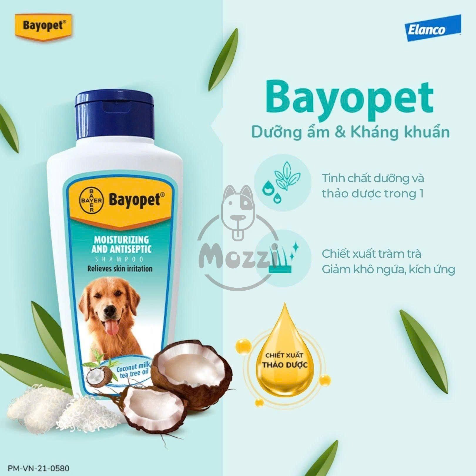 - Giảm khô ngứa, kích ứng cùng Bayopet “Dưỡng ẩm & Kháng khuẩn”: Chiết xuất dầu dừa, dầu tràm trà giúp kháng khuẩn, kháng viêm, cải thiện tình trạng khô ngứa và kích ứng da lông.