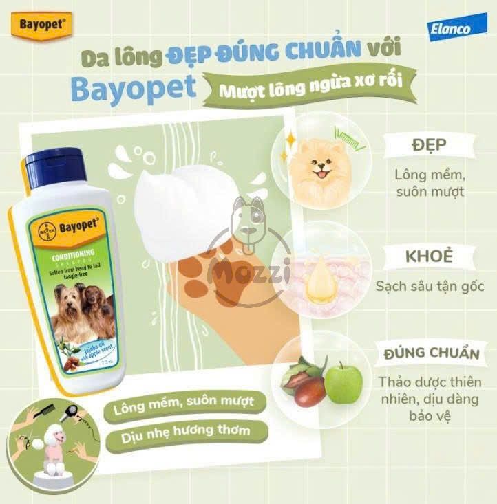 - Suôn mềm, óng ả cùng Bayopet “Mượt lông ngừa xơ rối”: Thành phần dầu Jojoba cùng hương táo dịu nhẹ giúp lông mềm, suôn mượt, khỏe mạnh từ đầu đến đuôi
