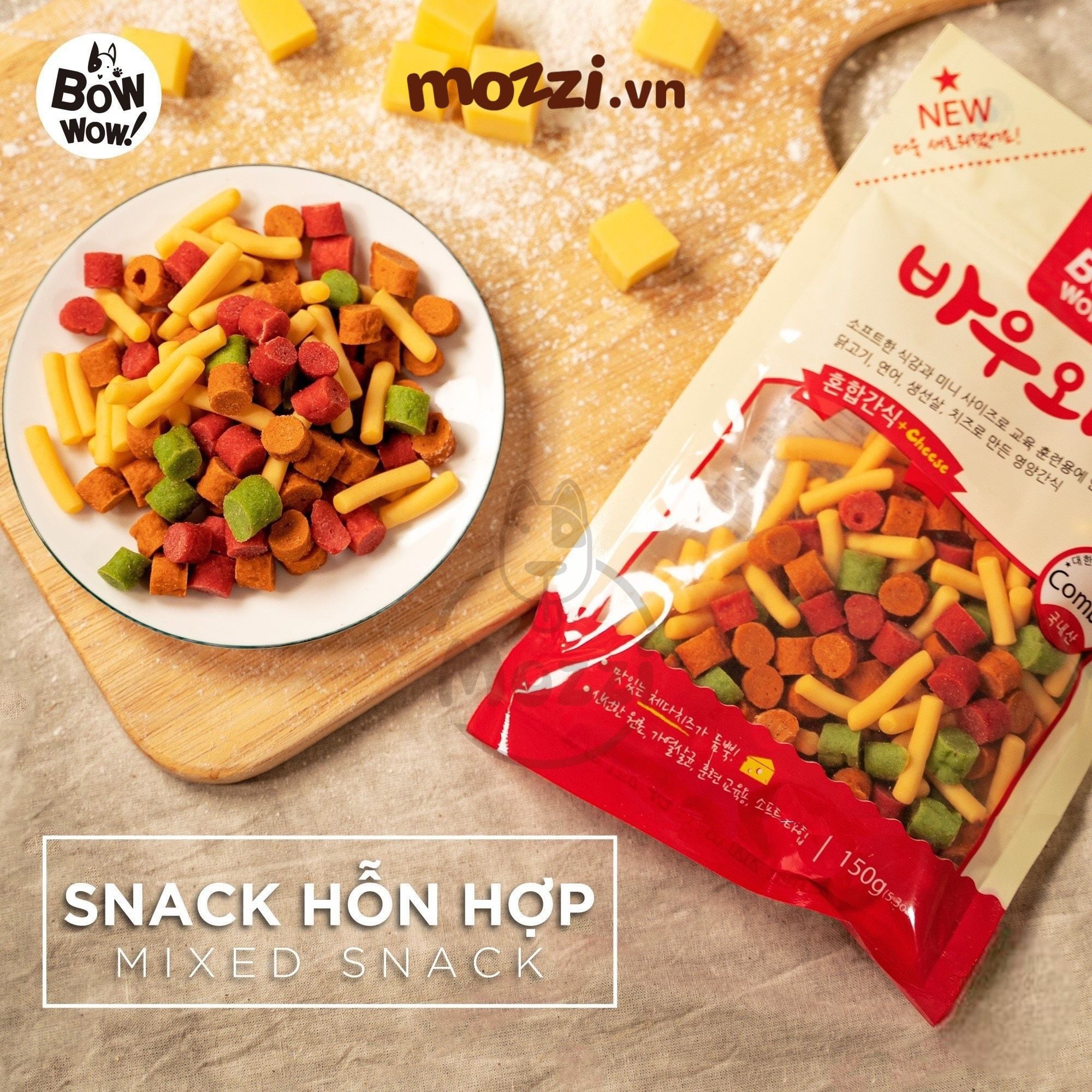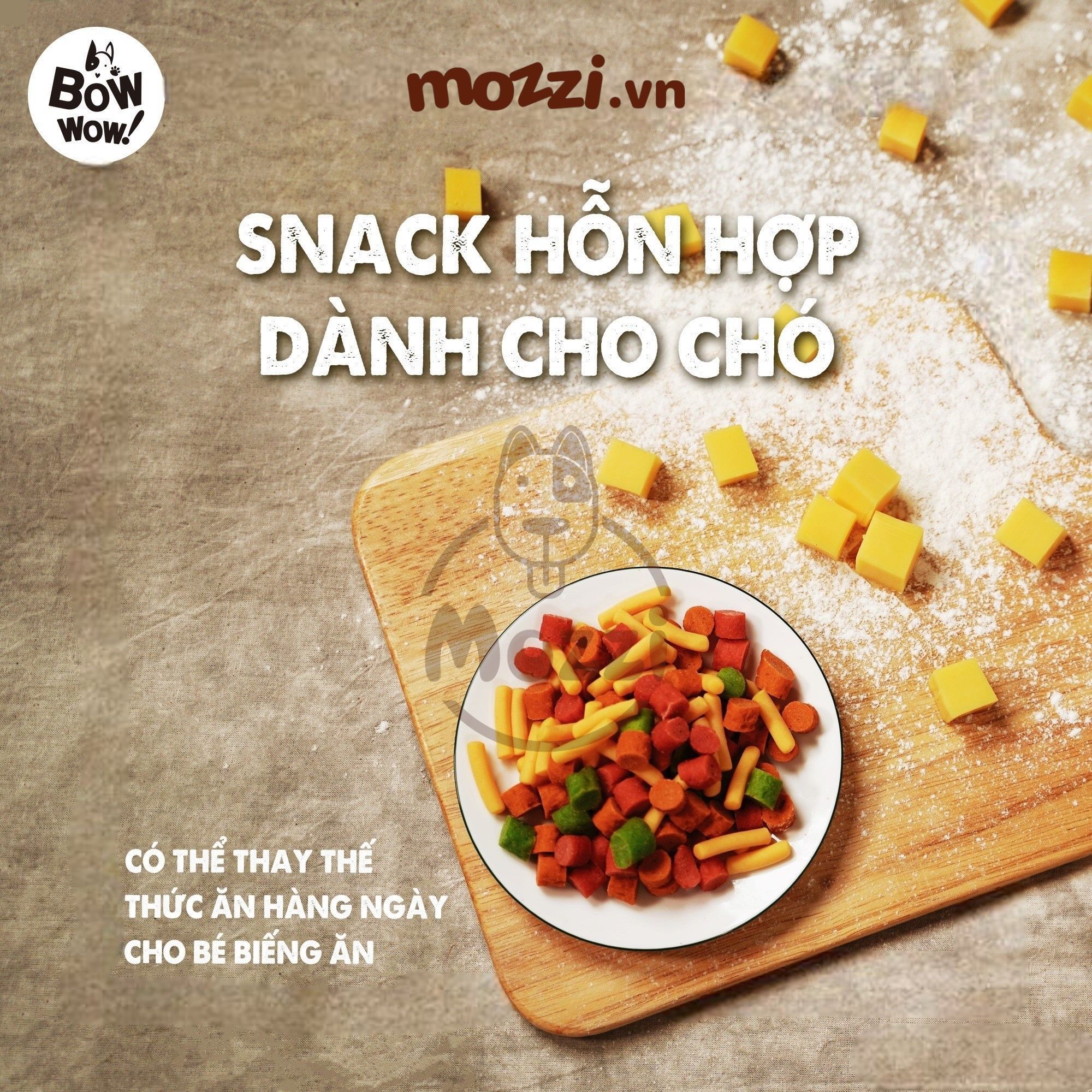 Snack hỗn hợp cho chó Bowwow với thành phần chính là thịt gà và cá hồi, là món ăn nhẹ bổ dưỡng, giàu protein và khoáng chất dành cho các chú chó, giúp bổ sung dinh dưỡng thiết yếu cho chó con đang phát triển và chó mẹ biếng ăn sau khi sinh con. Snack được cả cún cưng và mèo cưng ưa chuộng.