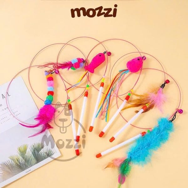 - Mèo con yêu sự cử động, chính vì vậy cần câu mèo được thiết kế để phục vụ sở thích này cho các bé. Nó được cấu tạo bởi một chiếc gậy và 1 sợi dây. Trông tương tự như một chiếc cần câu cá. Phía đầu dây có buộc những sợi lông vũ có gắn chuông lục lạp phát ra âm thanh.