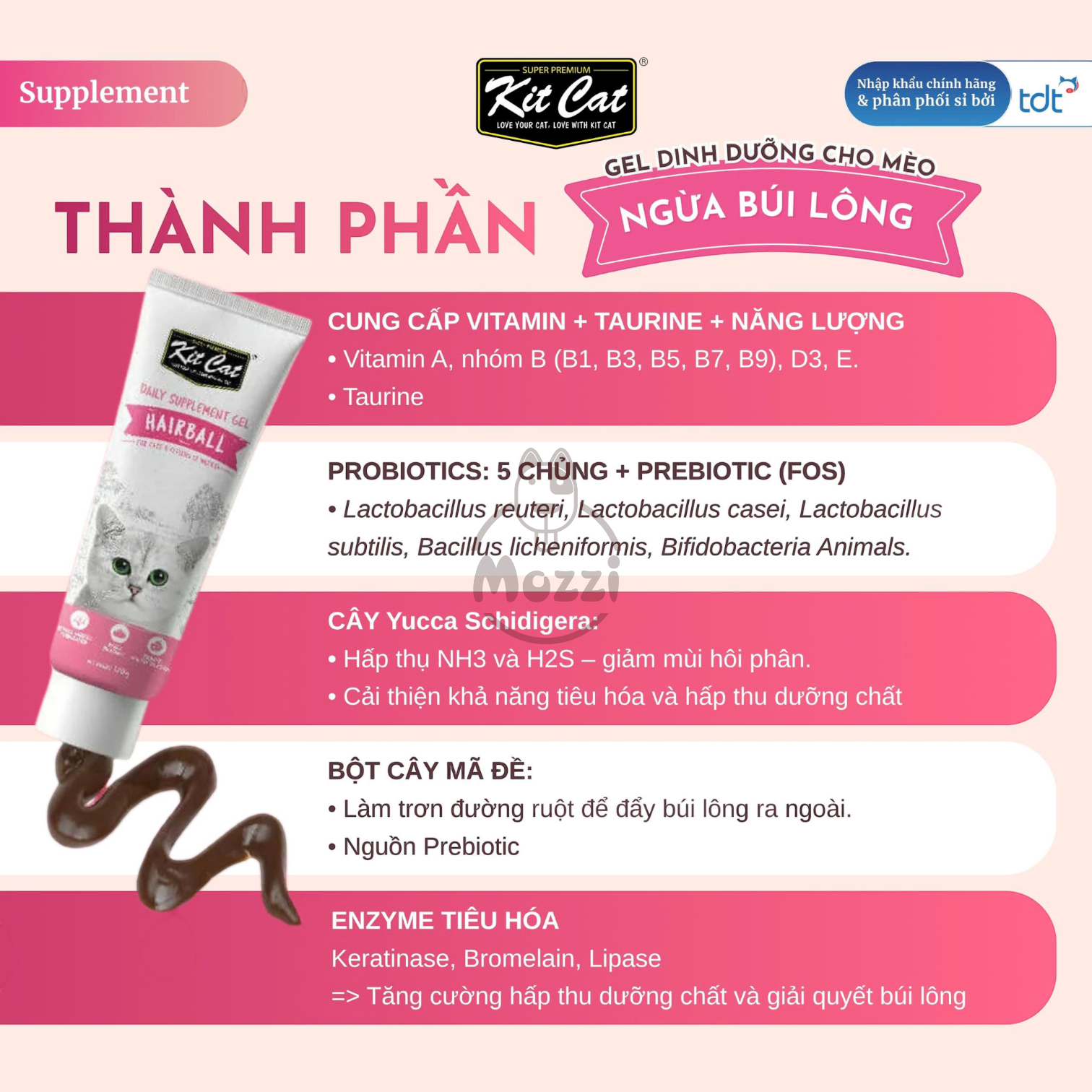 Ngoài ra, Kit Cat Daily Supplement Gel Hairball Gel còn giúp hỗ trợ điều trị và phòng ngừa búi lông hiệu quả nhờ hiệu quả hợp lực từ: