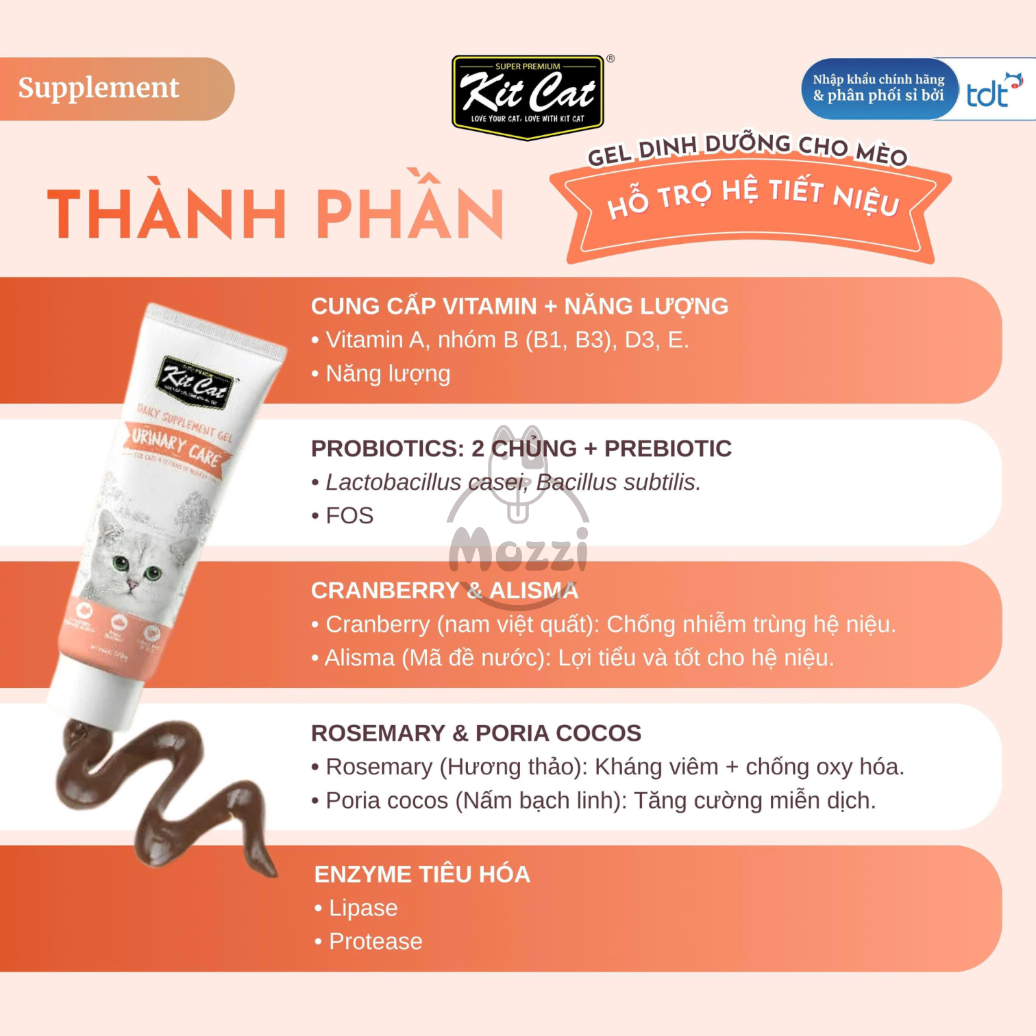 Ngoài ra, Kit Cat Daily Supplement Gel Urinary Care còn giúp hỗ trợ điều trị và phòng ngừa bệnh tiết niệu hiệu quả nhờ sự hiệp lực từ các thành phần tự nhiên: Cranberry, Mã đề nước, Hương thảo, Nấm Bạch Linh