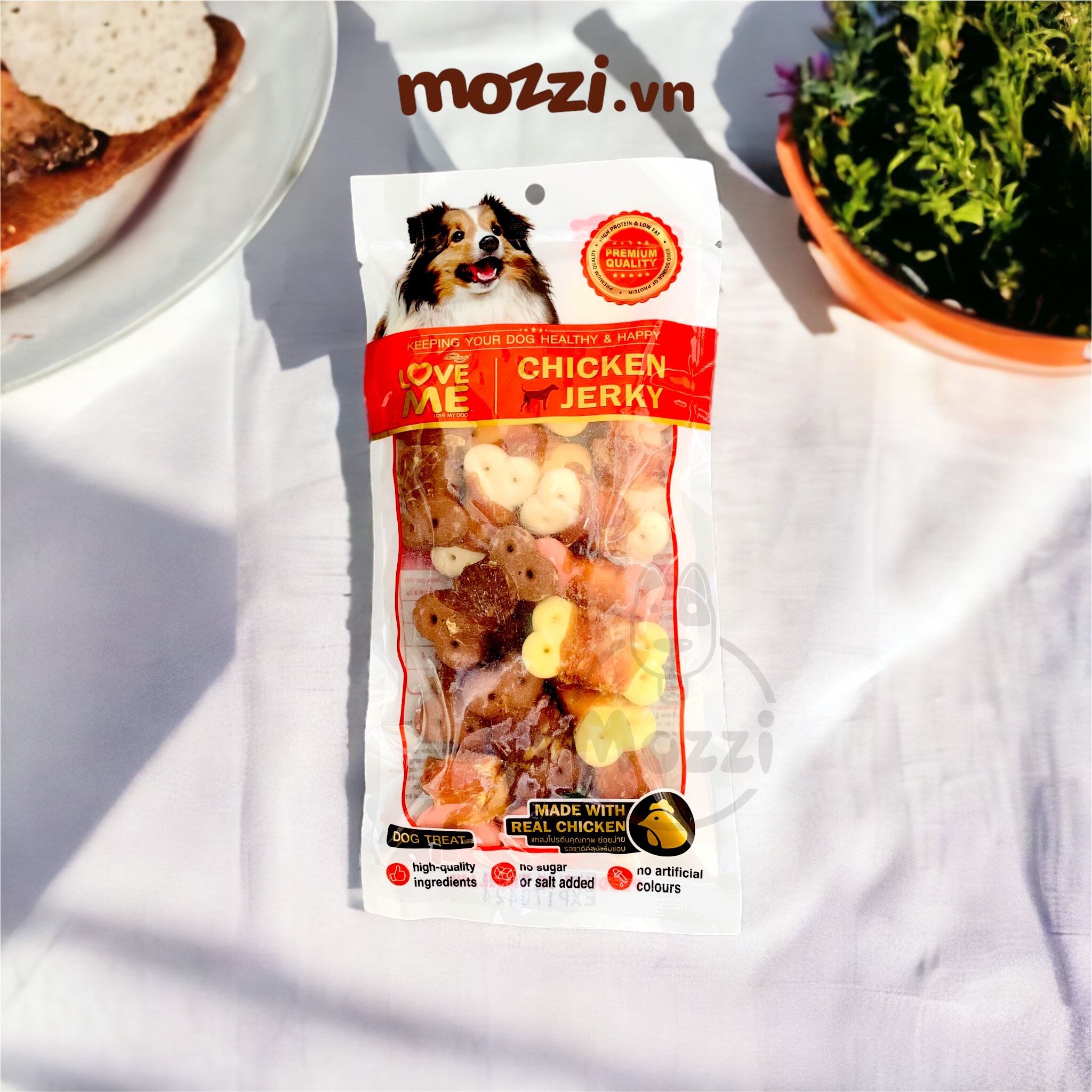 Thức ăn vặt Love Me Chicken Jerky thịt gà sấy kết hợp cá sợi, xương sữa dê, bánh quy là một loại đồ ăn vặt cho chó đang được ưa chuộng. Bạn không cần phải mất thời gian chế biến nhưng cún cưng của bạn vận được ăn và hấp thụ những chất dinh dưỡng tốt nhất. Sản phẩm đảm bảo an toàn cho sức khỏe cún cưng, đặc biệt rất thích hợp để làm bánh thưởng trong việc huấn luyện.