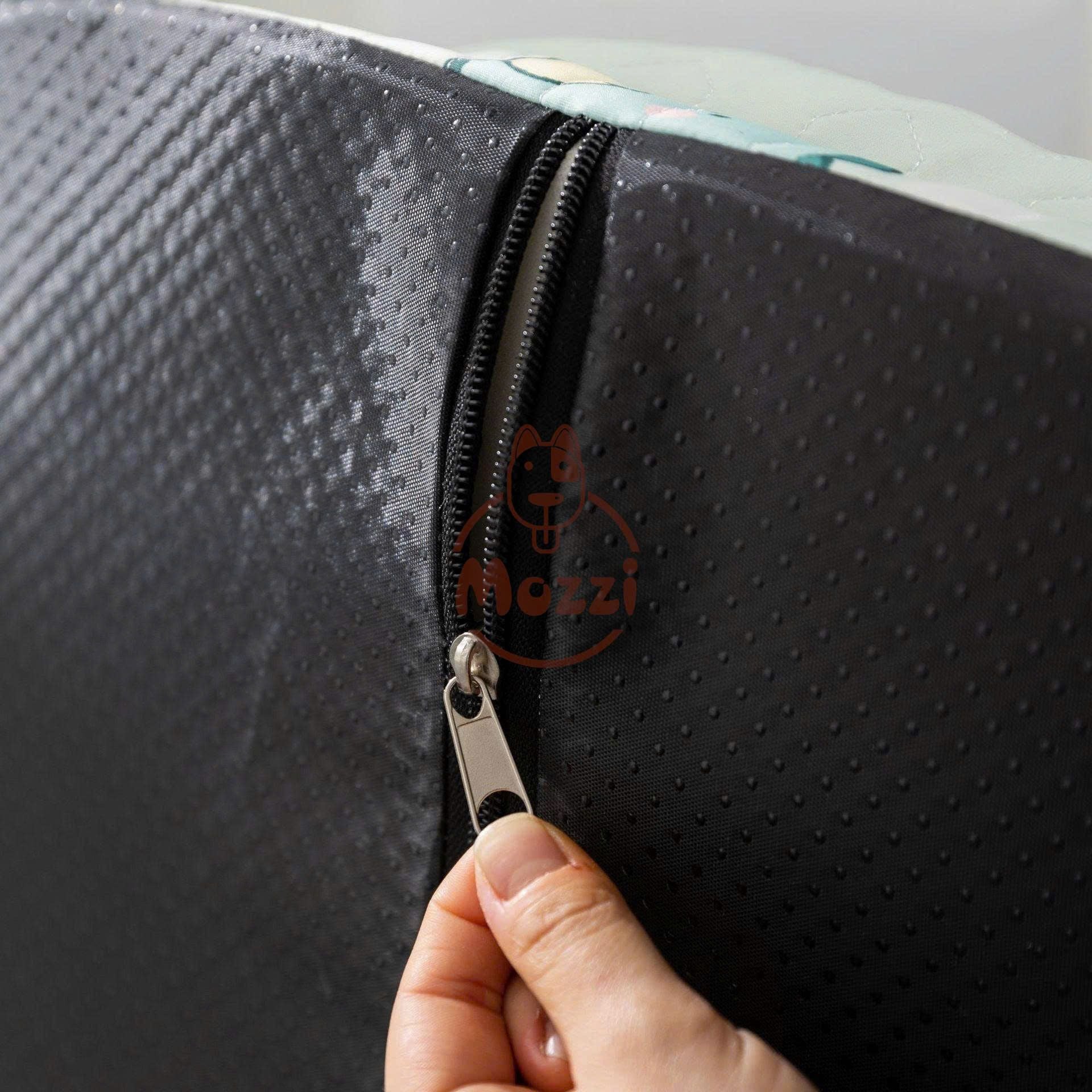 Chất liệu lụa băng co giãn mát lạnh khó bám bẩn, không dính lông, có lớp latex 0.2cm, mút xốp 2cm. Thành xốp độ cao vừa phải, dễ dàng cho các bé ưng kê đầu hoặc gác chân. Có khóa kéo để tháo ruột nệm, dễ dàng vệ sinh.