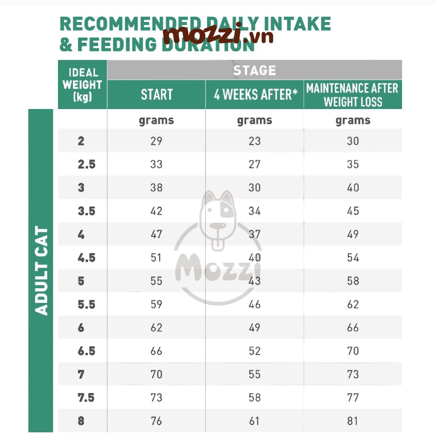 - Xác định cân nặng mục tiêu và sau đó thiết lập khẩu phần ăn. Lượng thức ăn khuyến cáo mỗi ngày dựa vào cân nặng lý tưởng của thú cưng. Khẩu phần ăn có thể cần được điều chỉnh qua các lần kiểm tra, dựa vào phản ứng cơ thể và tốc độ giảm cân của mỗi chú mèo. Mục tiêu cần đạt được là giảm từ 1 - 3% trọng lượng cơ thể mỗi tuần trong 3 tháng đầu và sau đó giảm từ 0,5 - 2%.