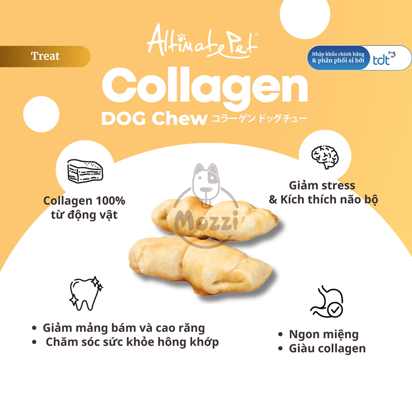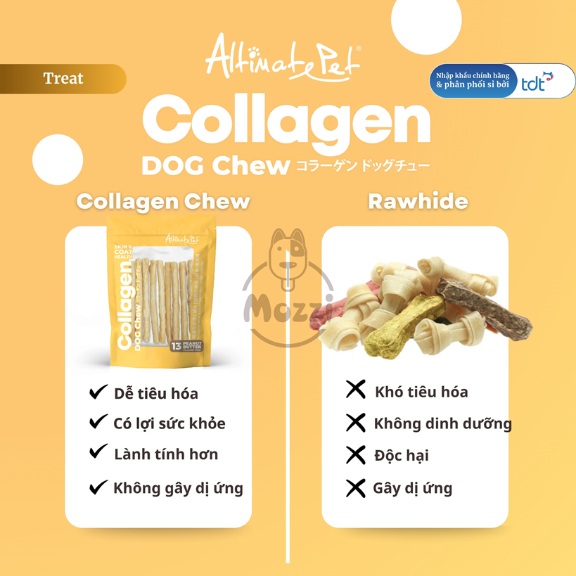Gặm Altimate Collagen Dog Chew là loại gặm dành riêng cho chó được làm từ gelatin (collagen thủy phân) nên cực kỳ lành tính và an toàn hơn nhiều so với gặm Rawhide truyền thống.